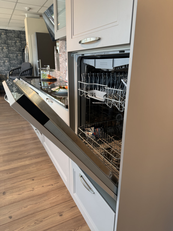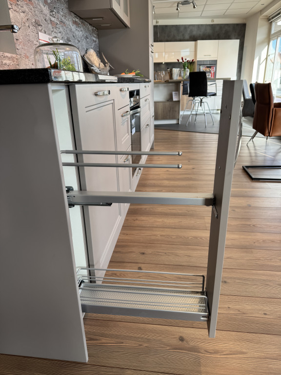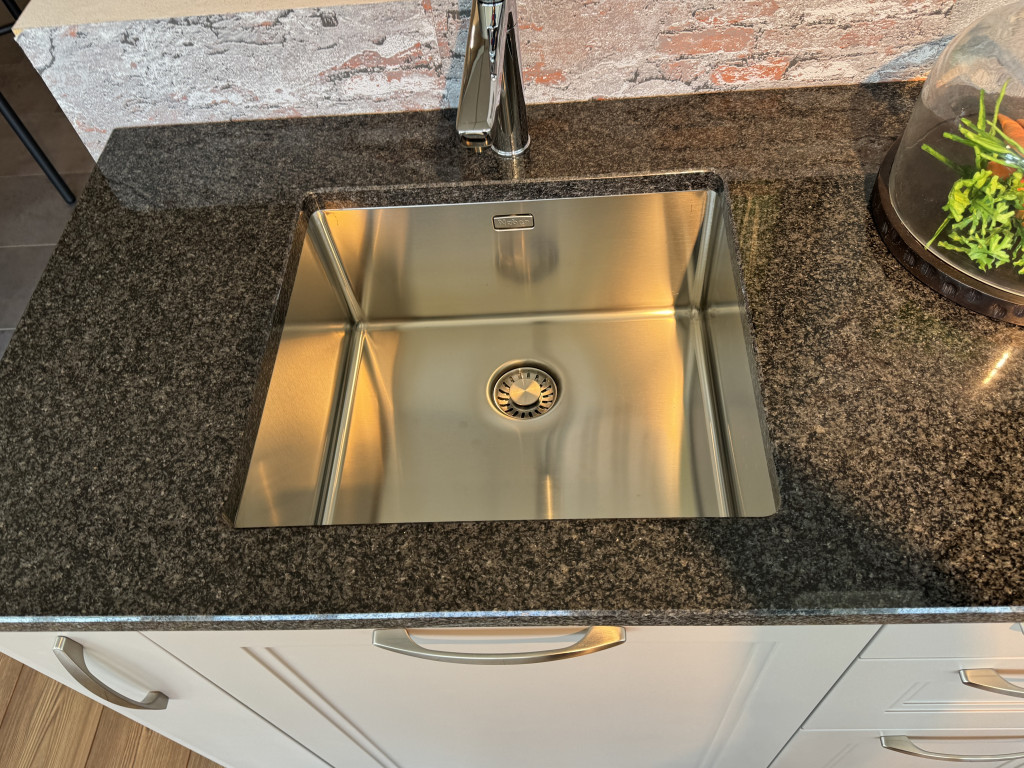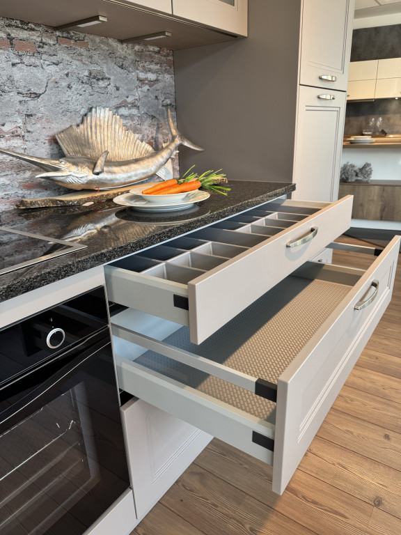 Musterküche TORINOtrüffelgrau lackiertmit Granit-ArbeitsplatteConstrukta ElektrogerätenEdelstahl-UnterbauspüleMischbatterieUnterbauleuchtenAbholpreis